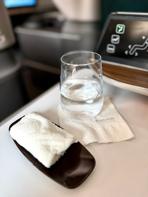 在椅上還沒坐熱,日籍FA就馬上搬出飲賓飲及熱毛巾。當下我頓了幾秒鐘,我是在搭長榮嗎?FA三語並用,真的是非常忙錄。